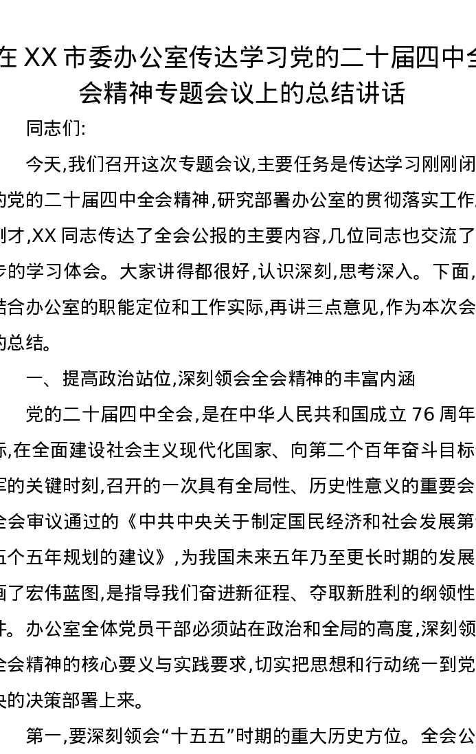 在XX市委办公室传达学习党的二十届四中全会精神专题会议上的总结讲话