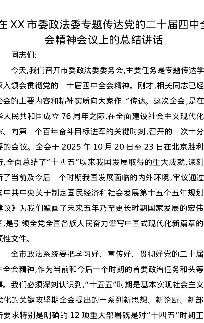 在XX市委政法委专题传达党的二十届四中全会精神会议上的总结讲话