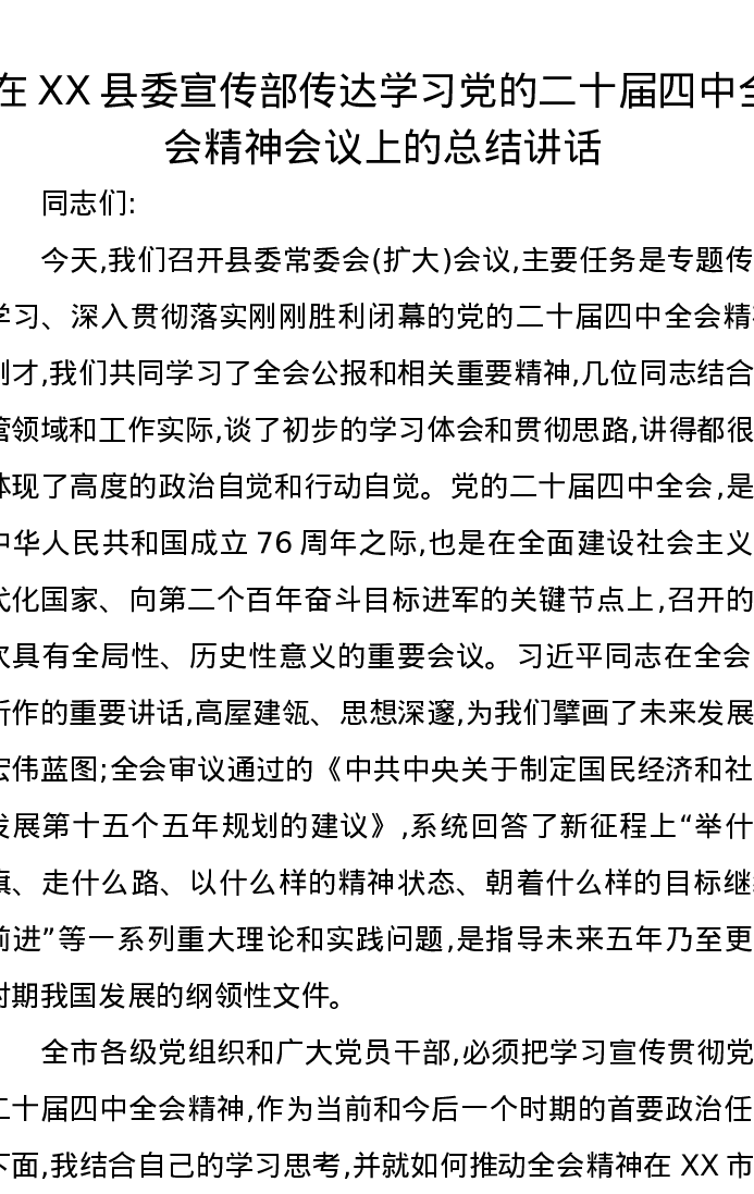 在XX县委宣传部传达学习党的二十届四中全会精神会议上的总结讲话