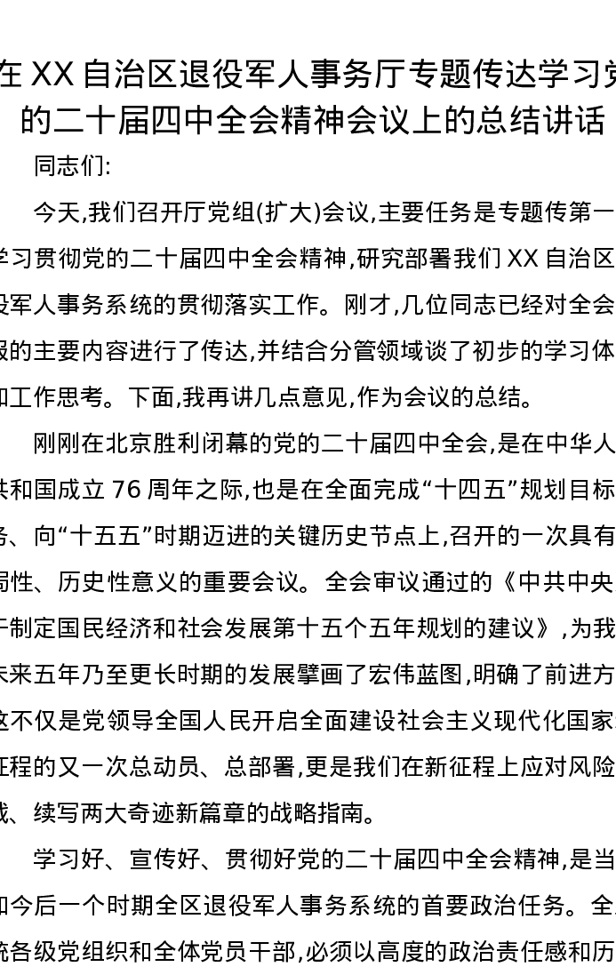 在XX自治区退役军人事务厅专题传达学习党的二十届四中全会精神会议上的总结讲话