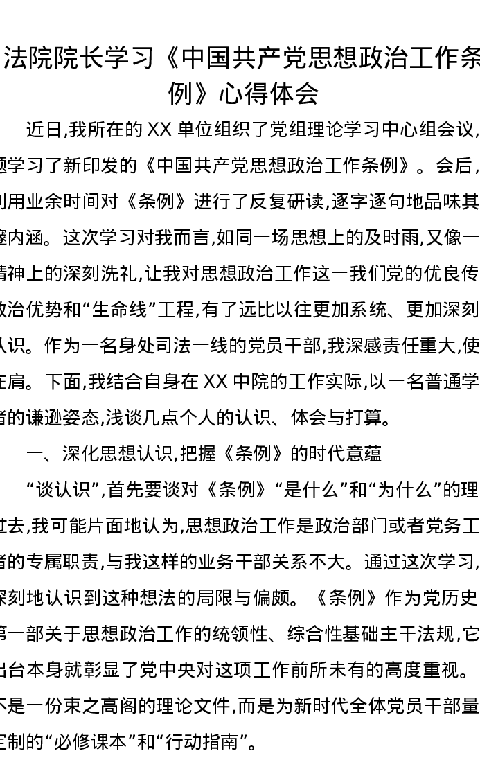 法院院长学习《中国共产党思想政治工作条例》心得体会