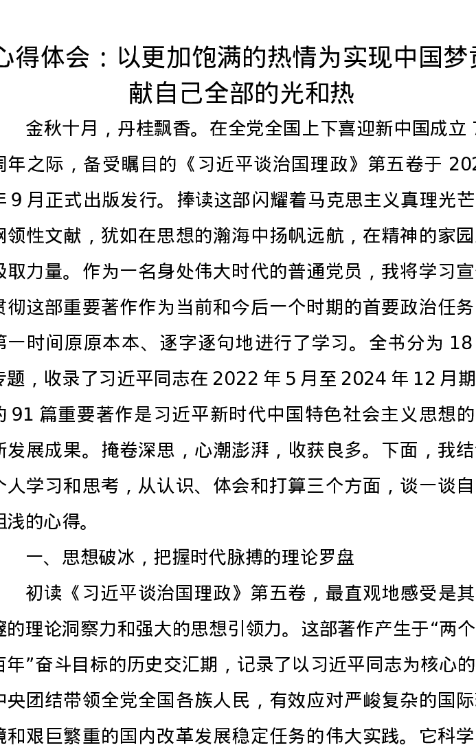 心得体会:以更加饱满的热情为实现中国梦贡献自己全部的光和热