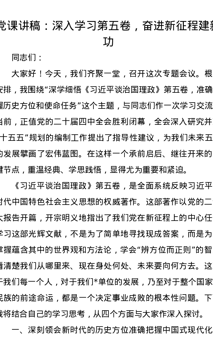 党课讲稿:深入学习第五卷,奋进新征程建新功