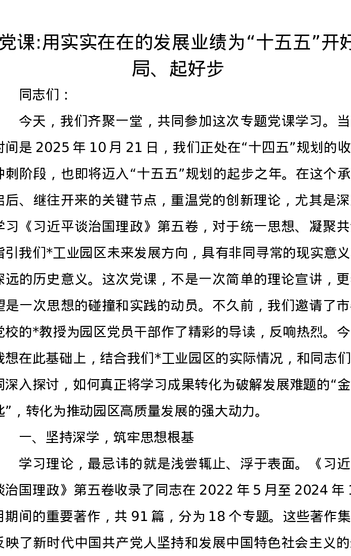 党课讲稿:用实实在在的发展业绩为“十五五”开好局、起好步