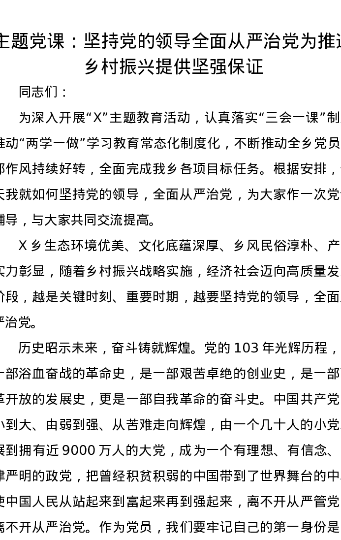 主题党课讲稿:坚持党的领导全面从严治党为推进乡村振兴提供坚强保证