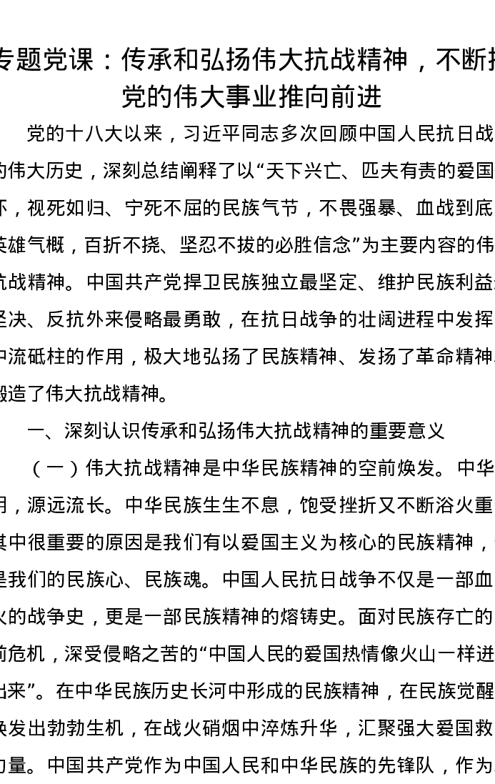 专题党课讲稿:传承和弘扬伟大抗战精神,不断把党的伟大事业推向前进