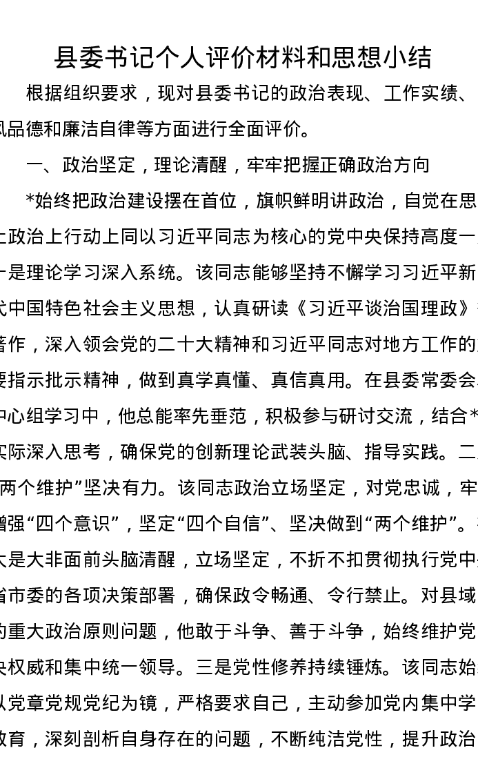 县委书记个人评价材料和思想小结
