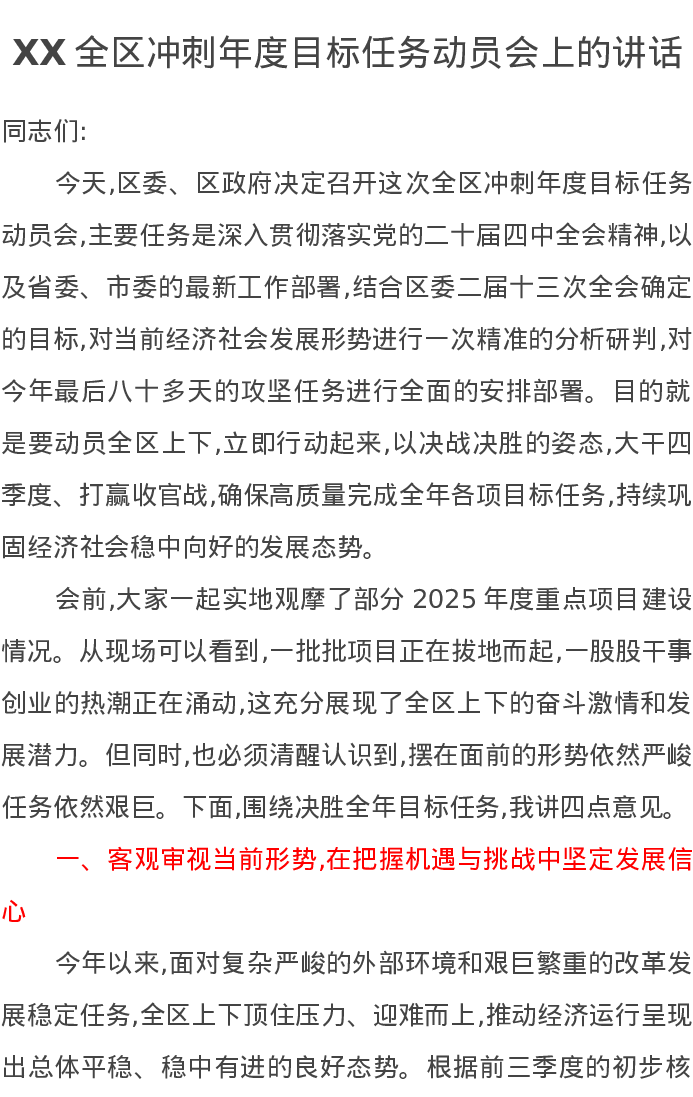XX全区冲刺年度目标任务动员会上的讲话