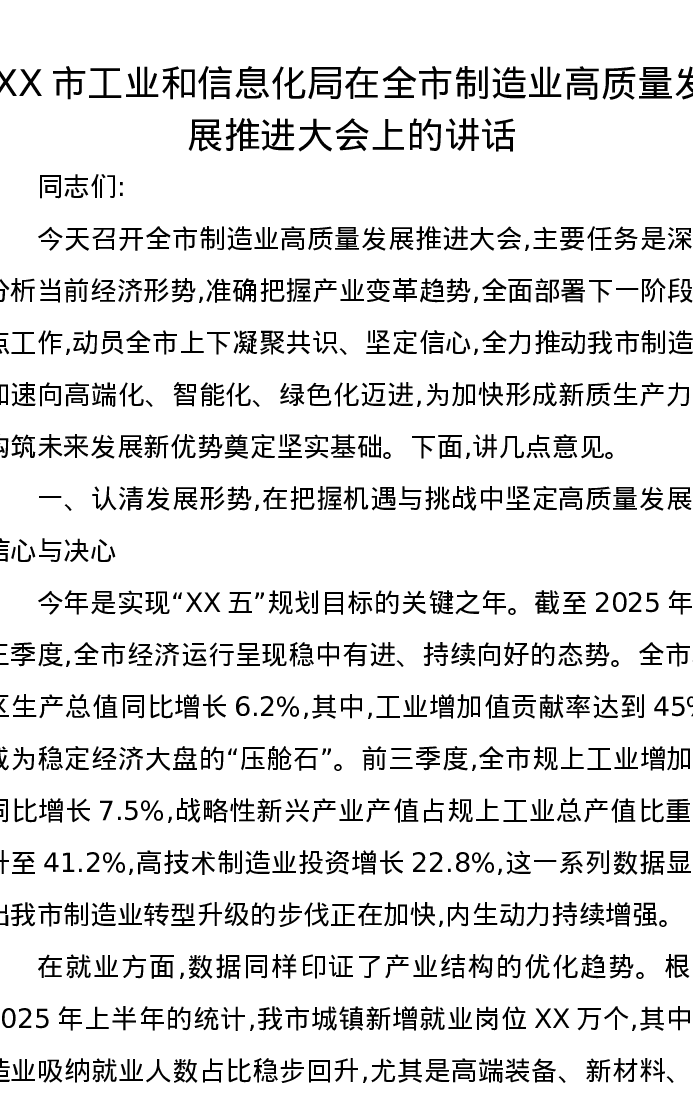 XX市工业和信息化局在全市制造业高质量发展推进大会上的讲话