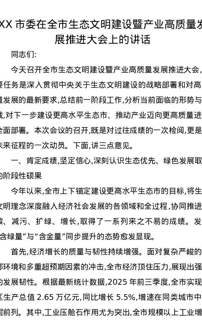 XX市委在全市生态文明建设暨产业高质量发展推进大会上的讲话