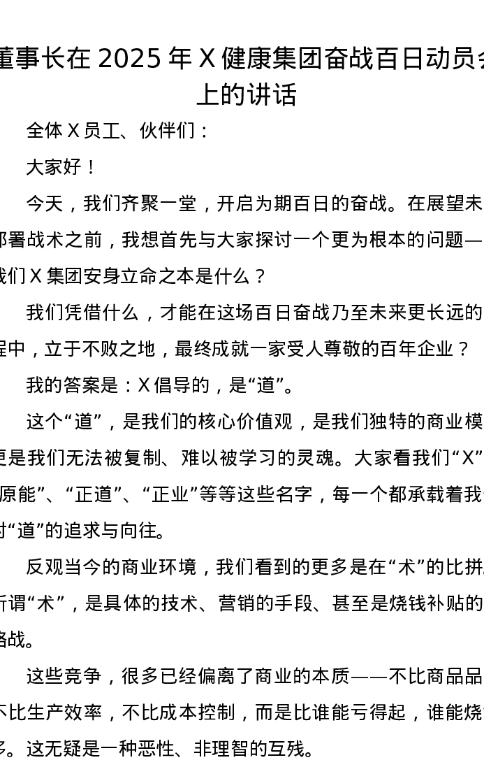 董事长在2025年X健康集团奋战百日动员会上的讲话