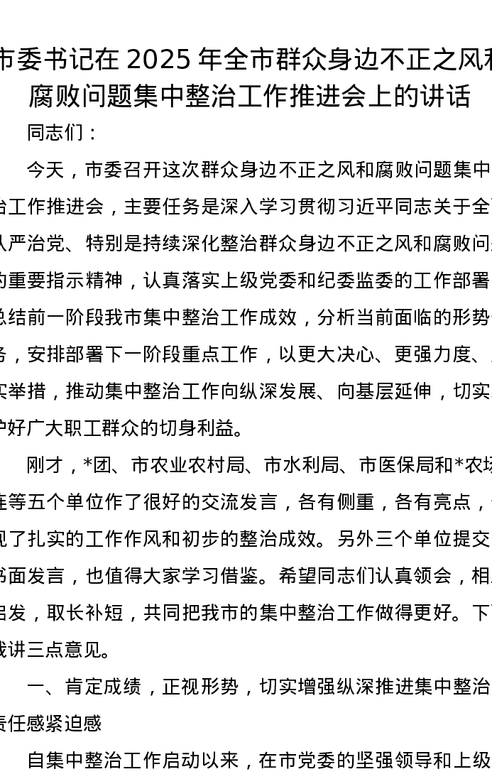 市委书记在2025年全市群众身边不正之风和腐败问题集中整治工作推进会上的讲话