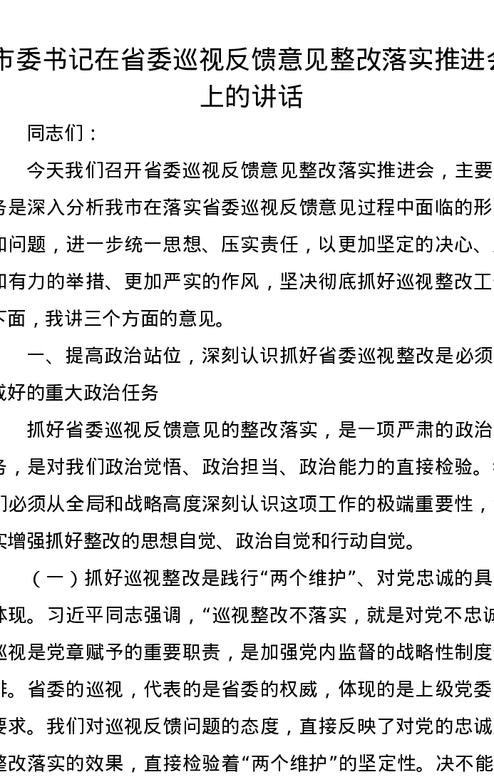 市委书记在省委巡视反馈意见整改落实推进会上的讲话