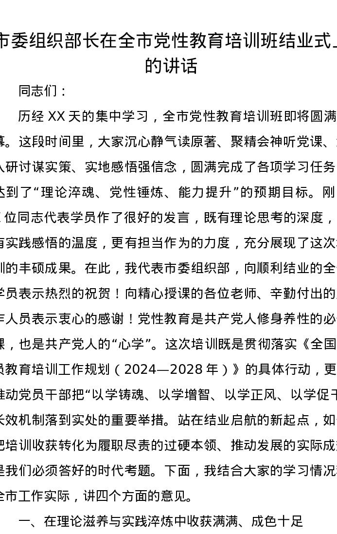 市委组织部长在全市党性教育培训班结业式上的讲话