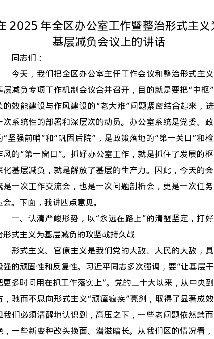 在2025年全区办公室工作暨整治形式主义为基层减负会议上的讲话