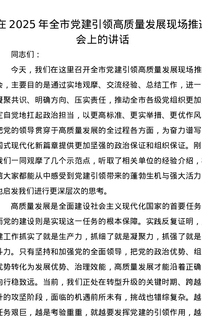 在2025年全市党建引领高质量发展现场推进会上的讲话