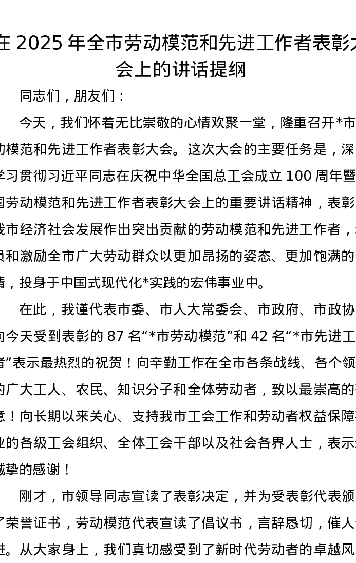 在2025年全市劳动模范和先进工作者表彰大会上的讲话提纲