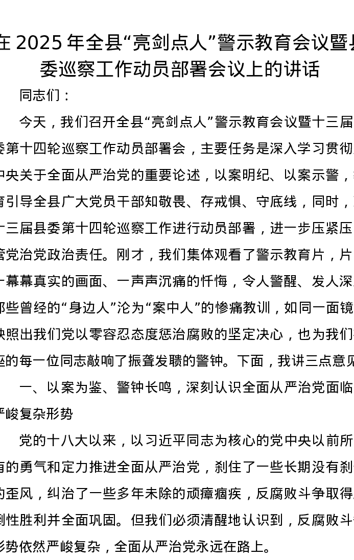 在2025年全县“亮剑点人”警示教育会议暨县委巡察工作动员部署会议上的讲话