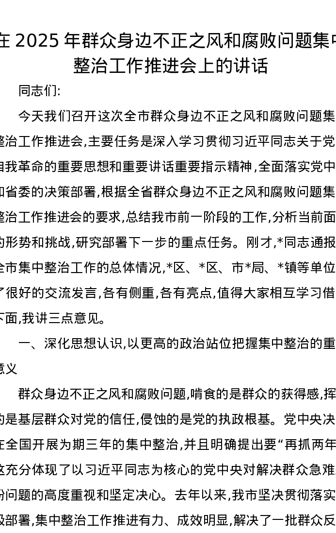 在2025年群众身边不正之风和腐败问题集中整治工作推进会上的讲话