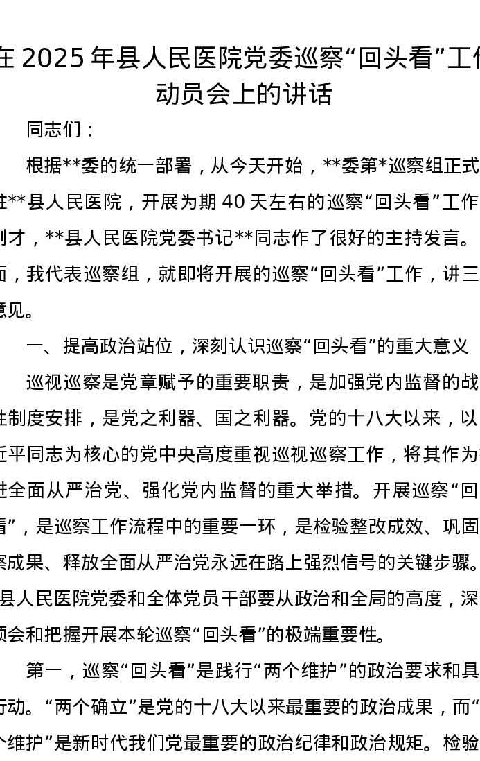 在2025年县人民医院党委巡察“回头看”工作动员会上的讲话