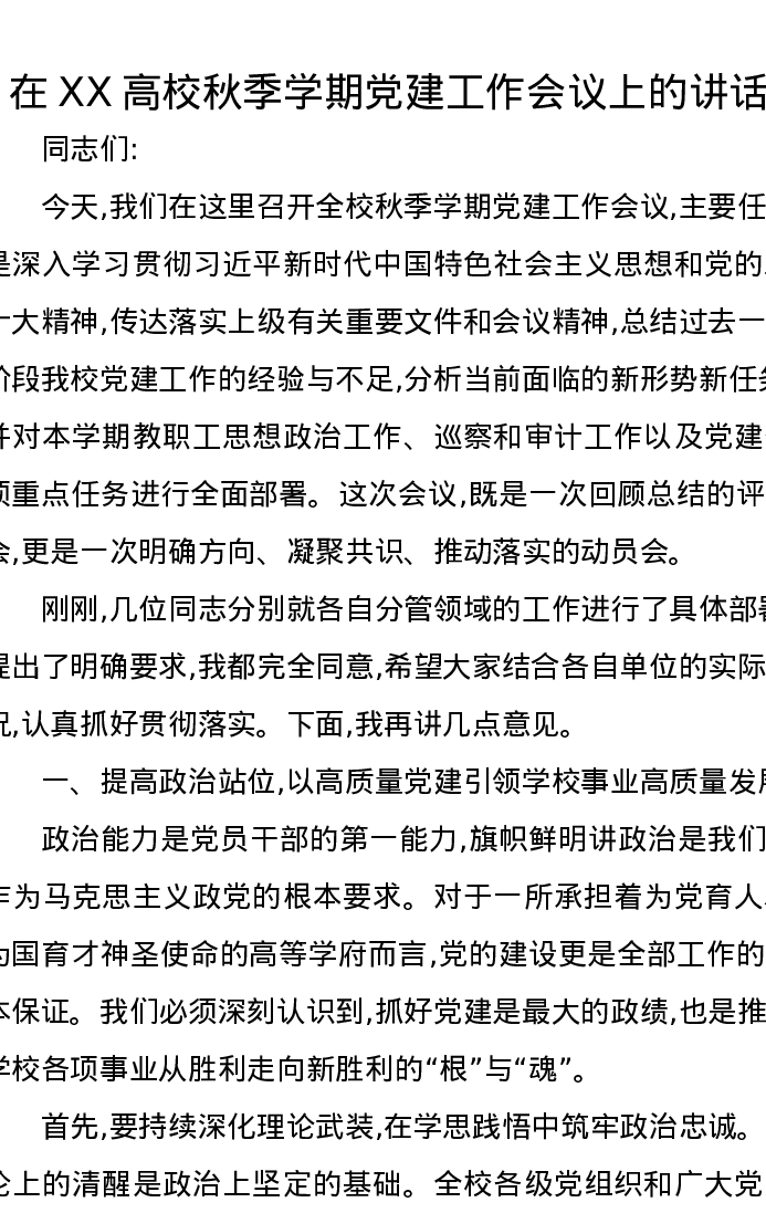 在XX高校秋季学期党建工作会议上的讲话