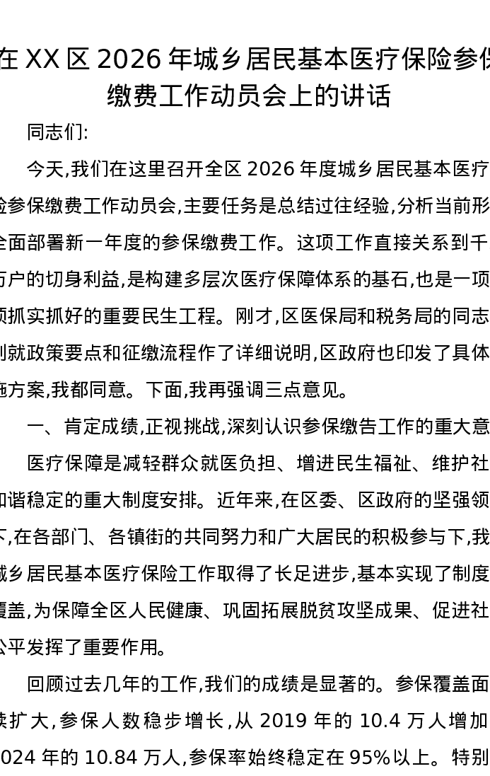 在XX区2026年城乡居民基本医疗保险参保缴费工作动员会上的讲话