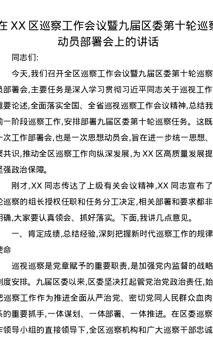 在XX区巡察工作会议暨九届区委第十轮巡察动员部署会上的讲话