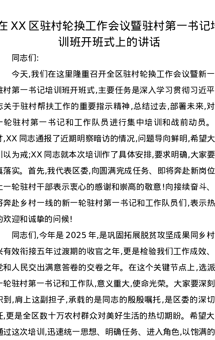 在XX区驻村轮换工作会议暨驻村第一书记培训班开班式上的讲话