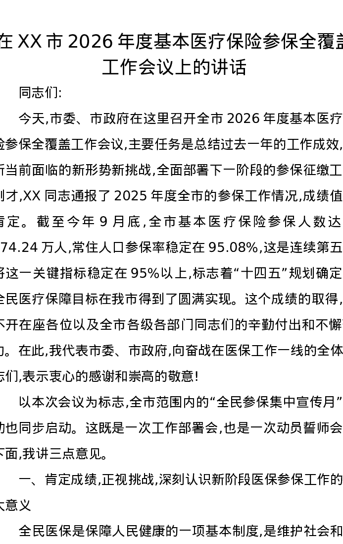在XX市2026年度基本医疗保险参保全覆盖工作会议上的讲话