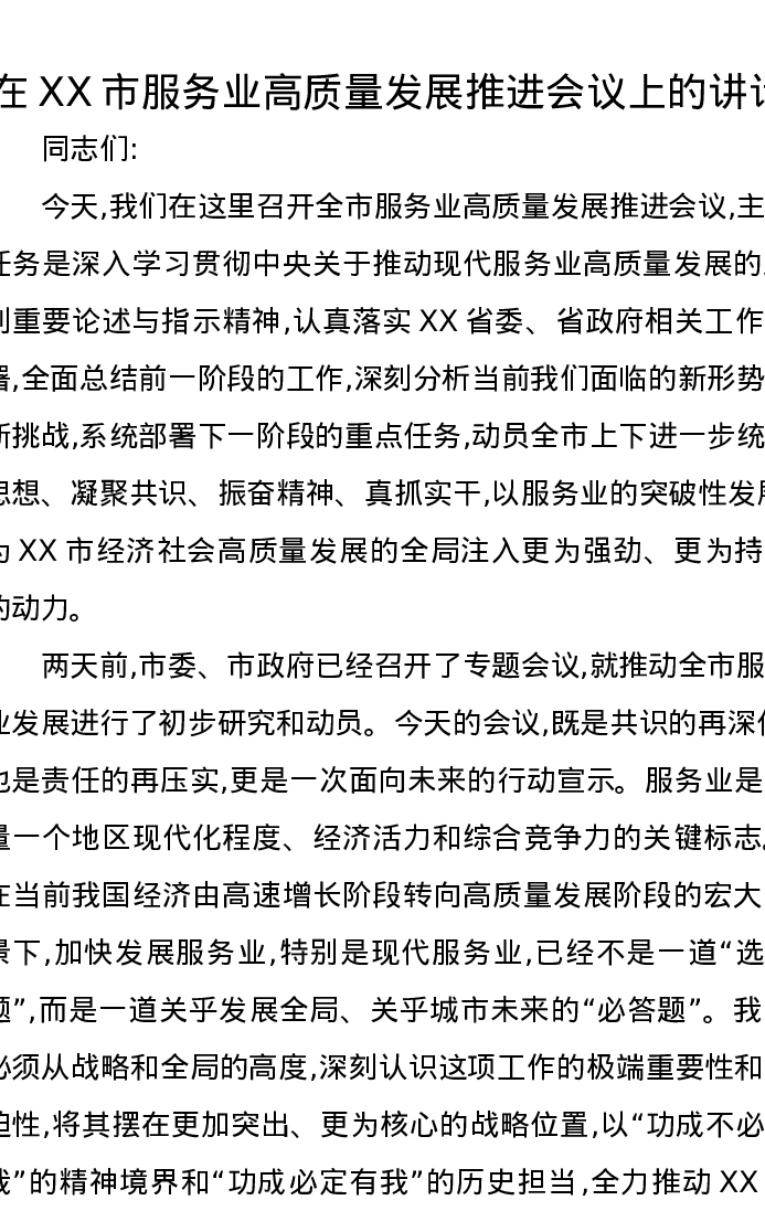 在XX市服务业高质量发展推进会议上的讲话