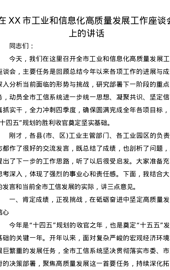 在XX市工业和信息化高质量发展工作座谈会上的讲话