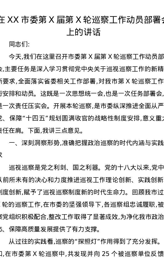 在XX市委第X届第X轮巡察工作动员部署会上的讲话