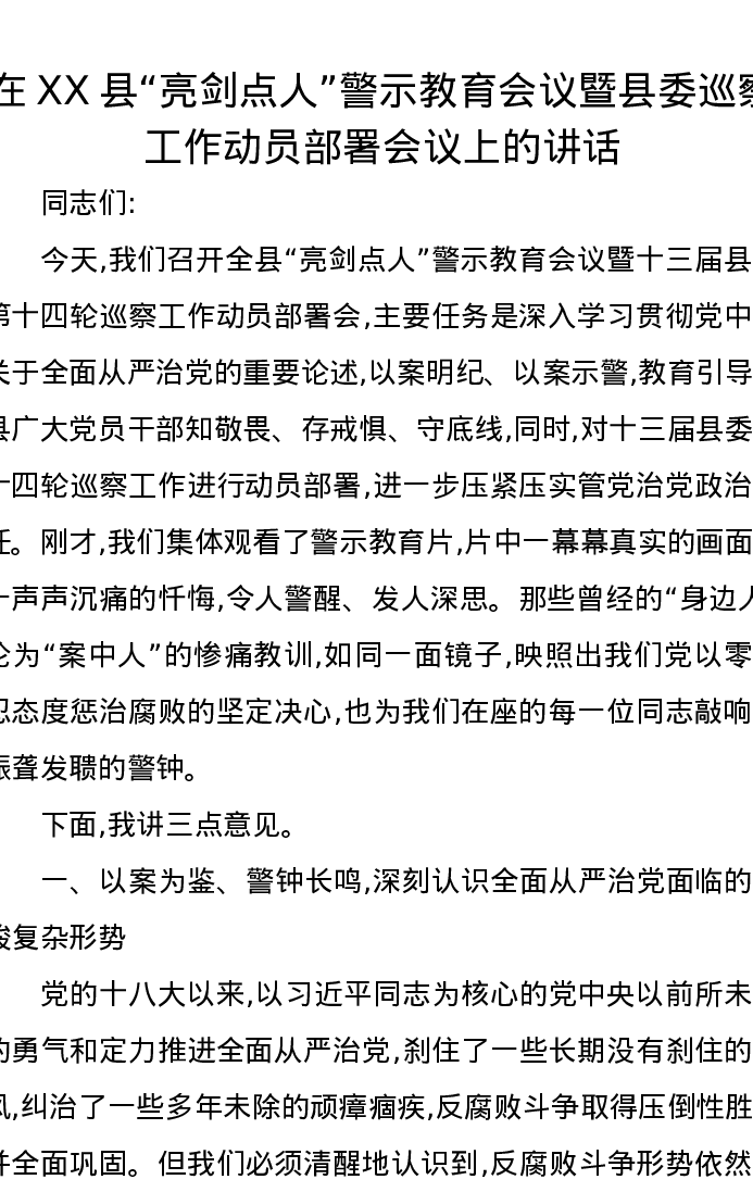 在XX县“亮剑点人”警示教育会议暨县委巡察工作动员部署会议上的讲话