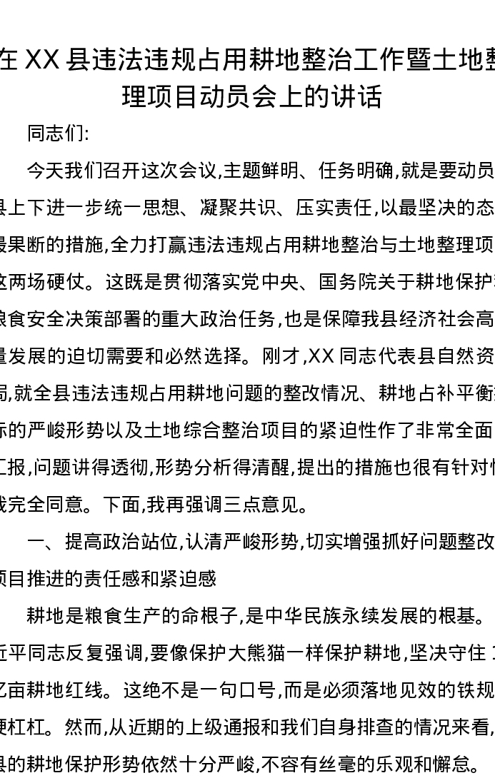 在XX县违法违规占用耕地整治工作暨土地整理项目动员会上的讲话