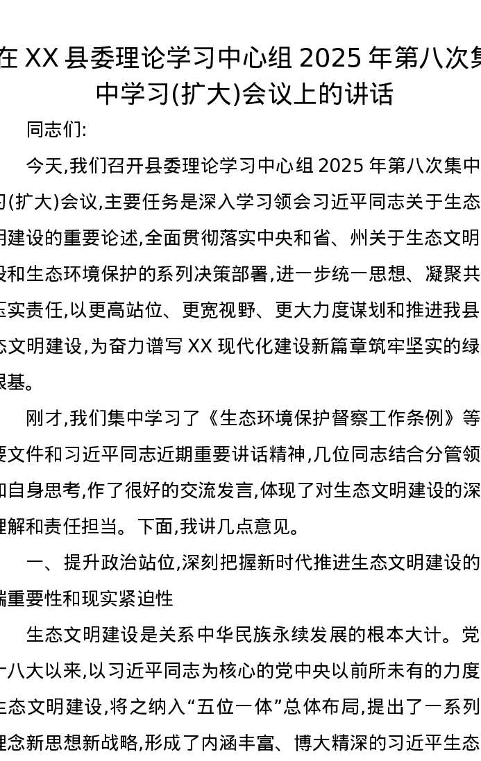 在XX县委理论学习中心组2025年第八次集中学习(扩大)会议上的讲话