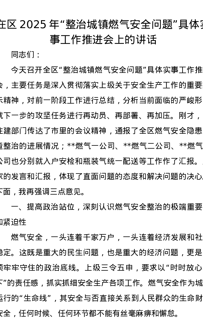 在区2025年“整治城镇燃气安全问题”具体实事工作推进会上的讲话
