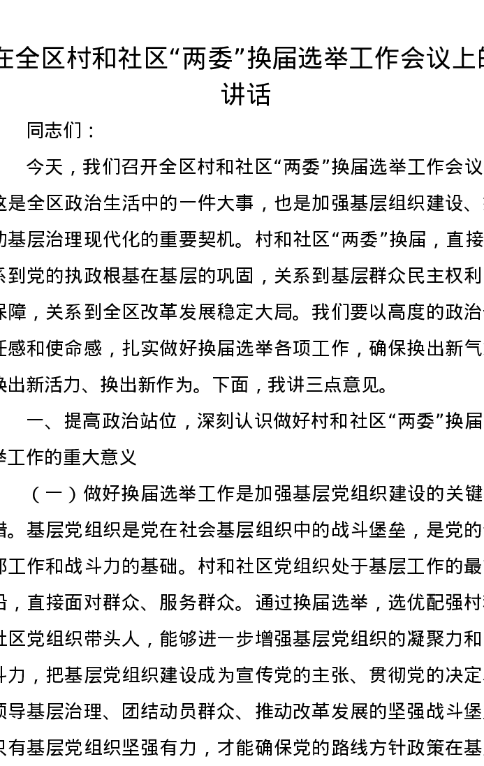 在全区村和社区“两委”换届选举工作会议上的讲话