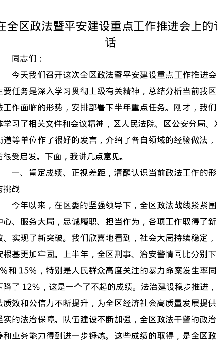 在全区政法暨平安建设重点工作推进会上的讲话