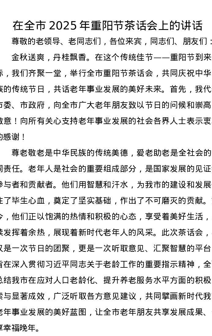 在全市2025年重阳节茶话会上的讲话