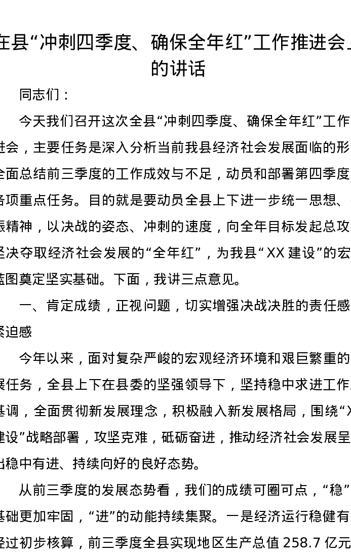 在县“冲刺四季度、确保全年红”工作推进会上的讲话