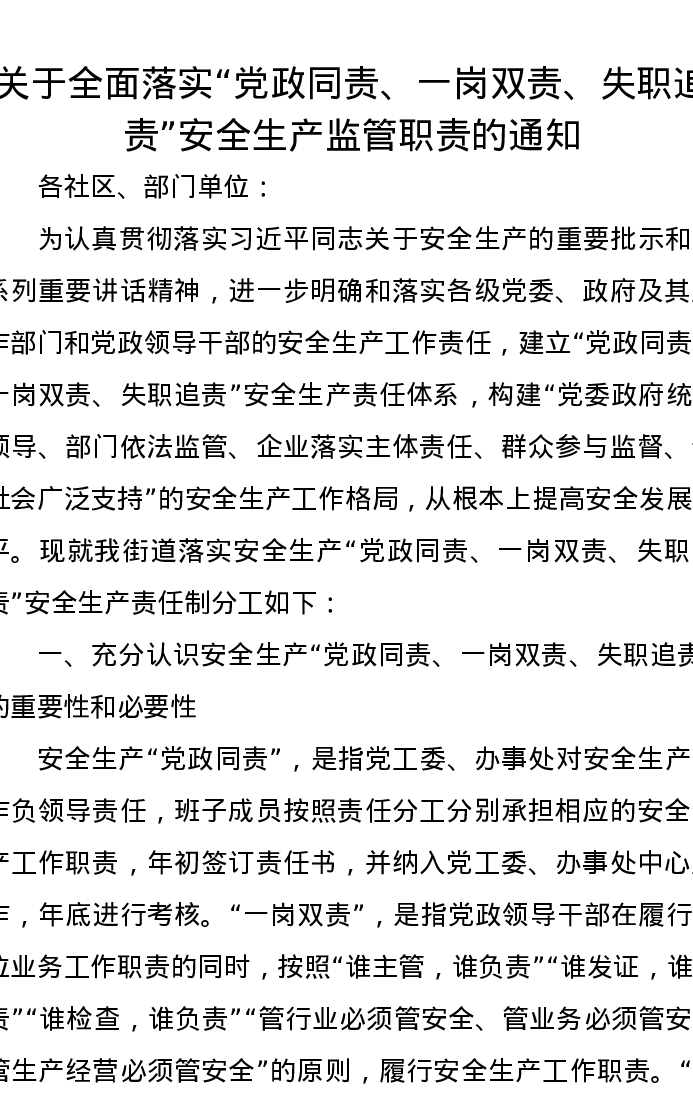 关于全面落实“党政同责、一岗双责、失职追责”安全生产监管职责的通知