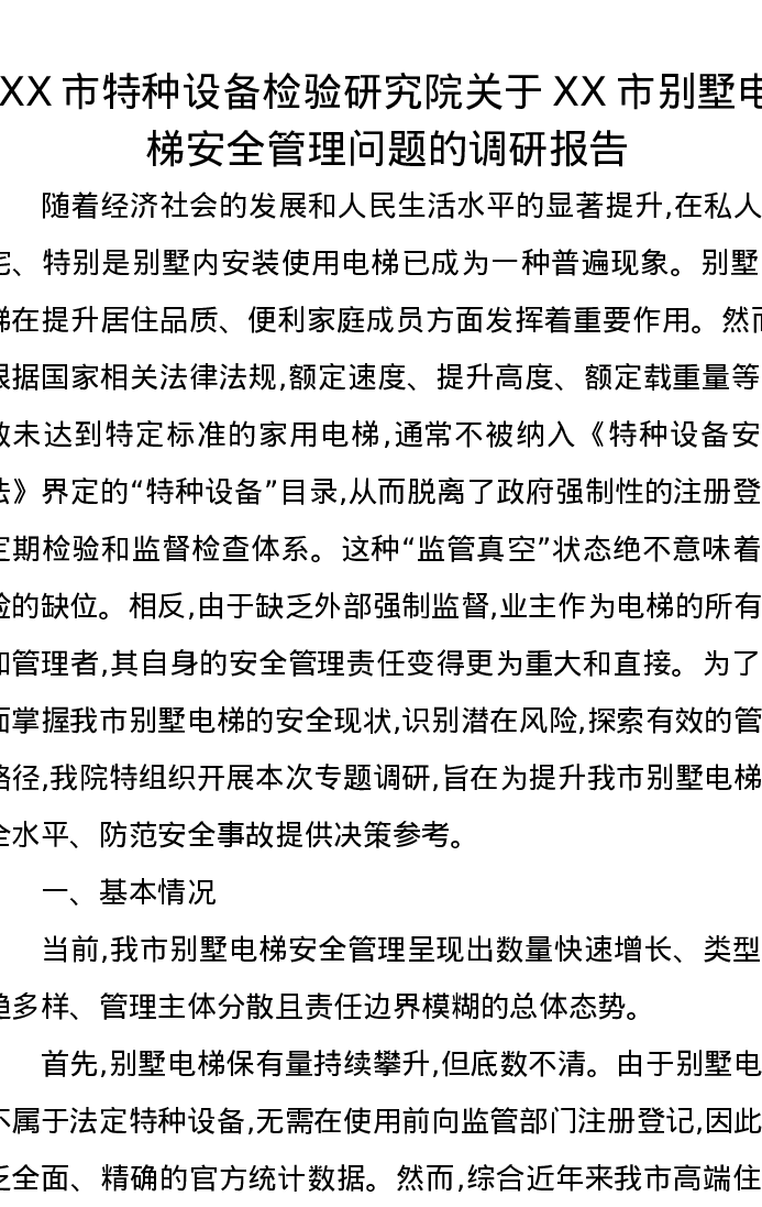 XX市特种设备检验研究院关于XX市别墅电梯安全管理问题的调研报告