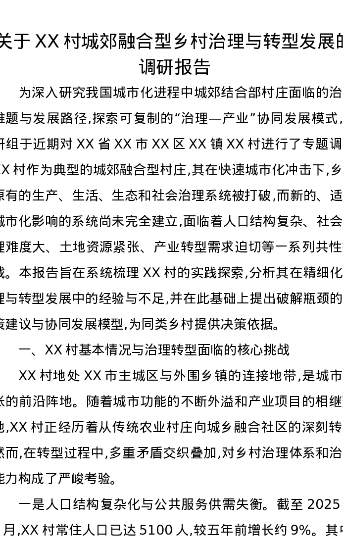 关于XX村城郊融合型乡村治理与转型发展的调研报告