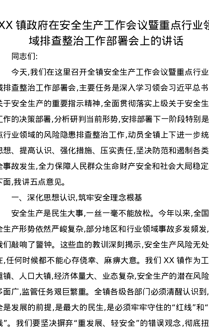 XX镇政府在安全生产工作会议暨重点行业领域排查整治工作部署会上的讲话