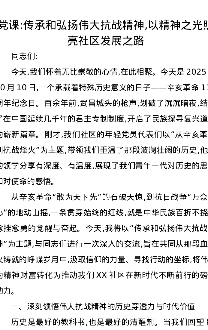 党课讲稿:传承和弘扬伟大抗战精神,以精神之光照亮社区发展之路