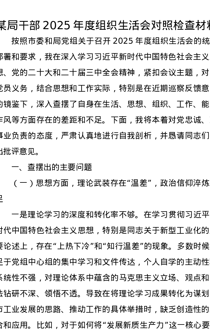 某局干部2025年度组织xxx对照检查材料