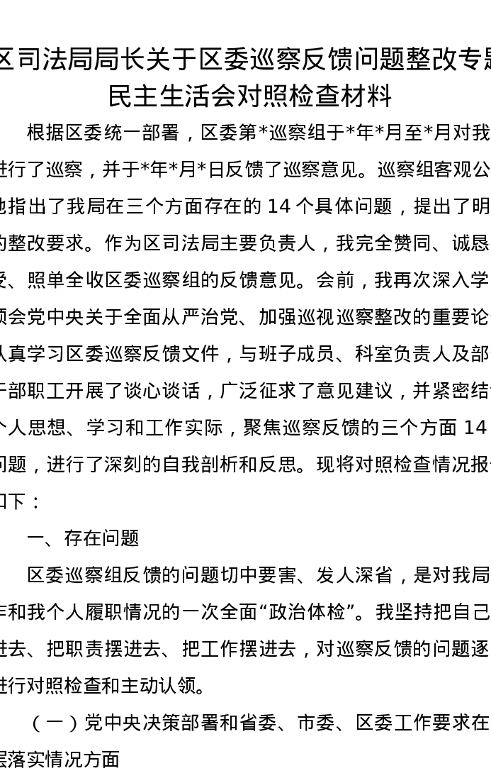 区司法局局长关于区委巡察反馈问题整改专题xxxxx对照检查材料