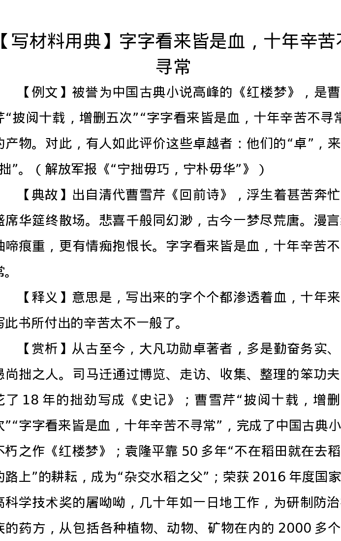 【写材料用典】字字看来皆是血,十年辛苦不寻常