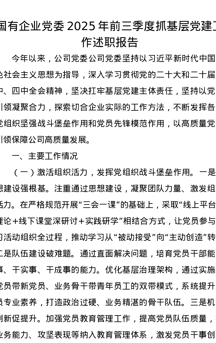 国有企业党委2025年前三季度抓基层党建工作述职报告