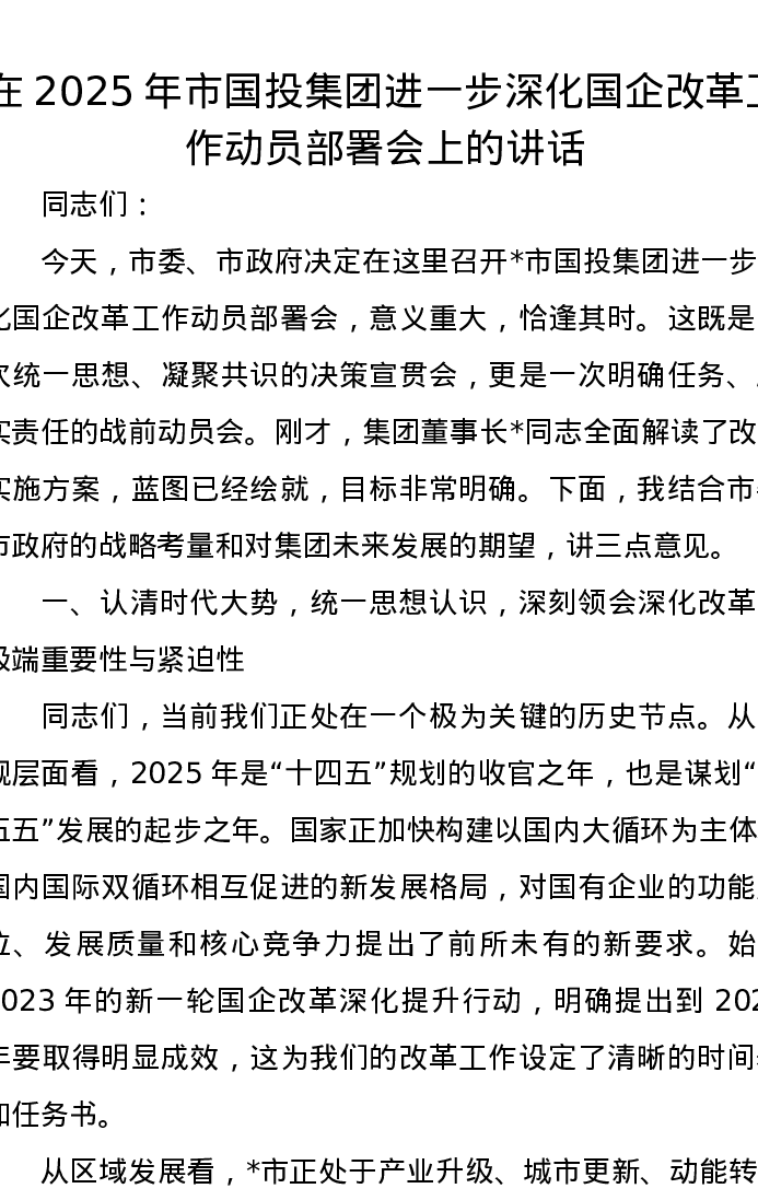 在2025年市国投集团进一步深化国企改革工作动员部署会上的讲话